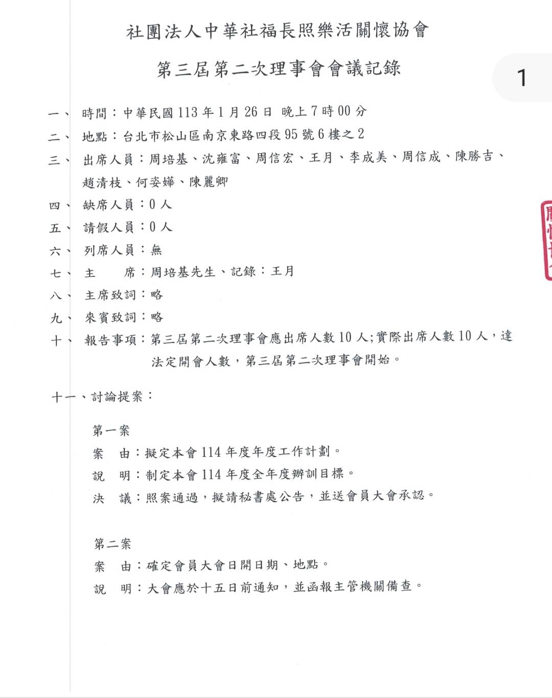 決 議:114年3月1日晚上7時00分於台北市松山區南京東路四段